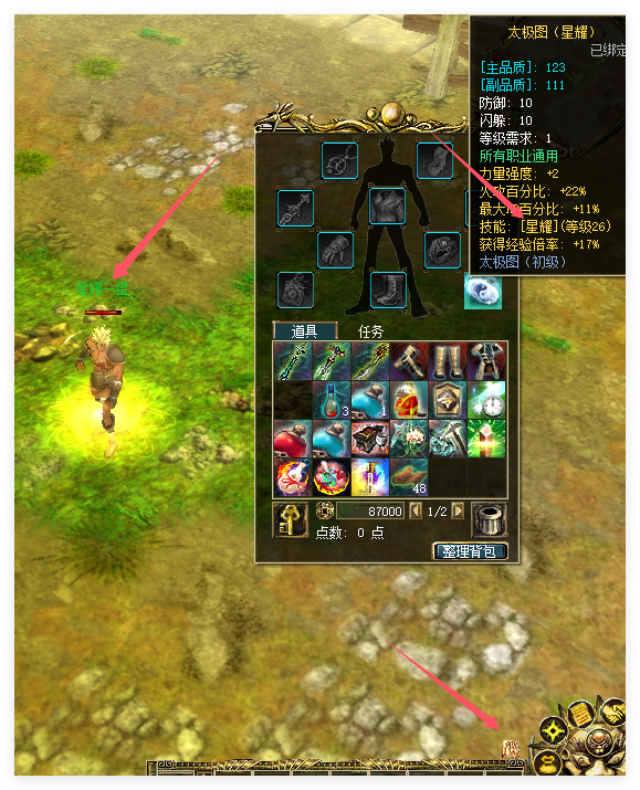 分为6级 上线背包赠送太极图(星耀) 太极图有百分之15左右的 经验倍率加成并附带称号,称号系统附带技能属性,该称号可以让自身全部属性增加10%
